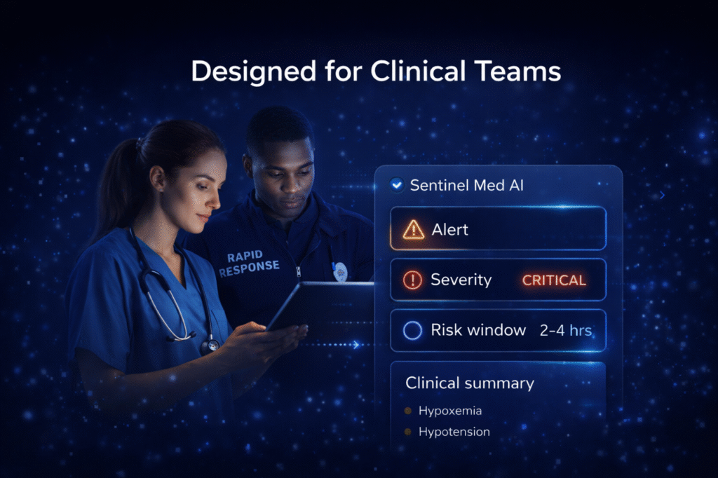 Sentinel Med AI is built to support nurses, rapid response teams, and bedside clinicians with clear, actionable early warning intelligence. Instead of overwhelming staff with complex dashboards, Sentinel delivers a focused signal: who is trending unstable, how severe the risk is, and how soon deterioration may occur—so teams can escalate sooner, with confidence.